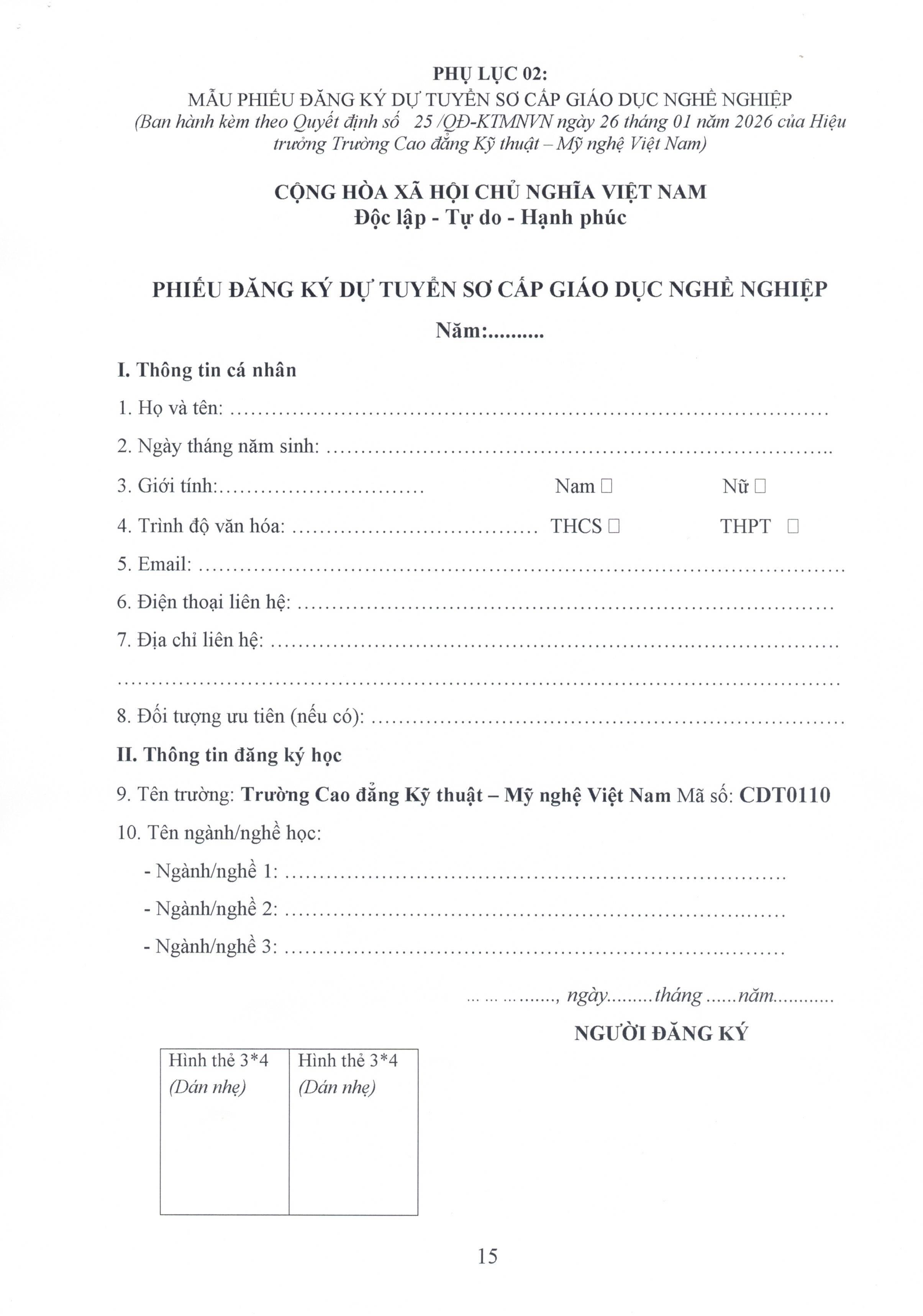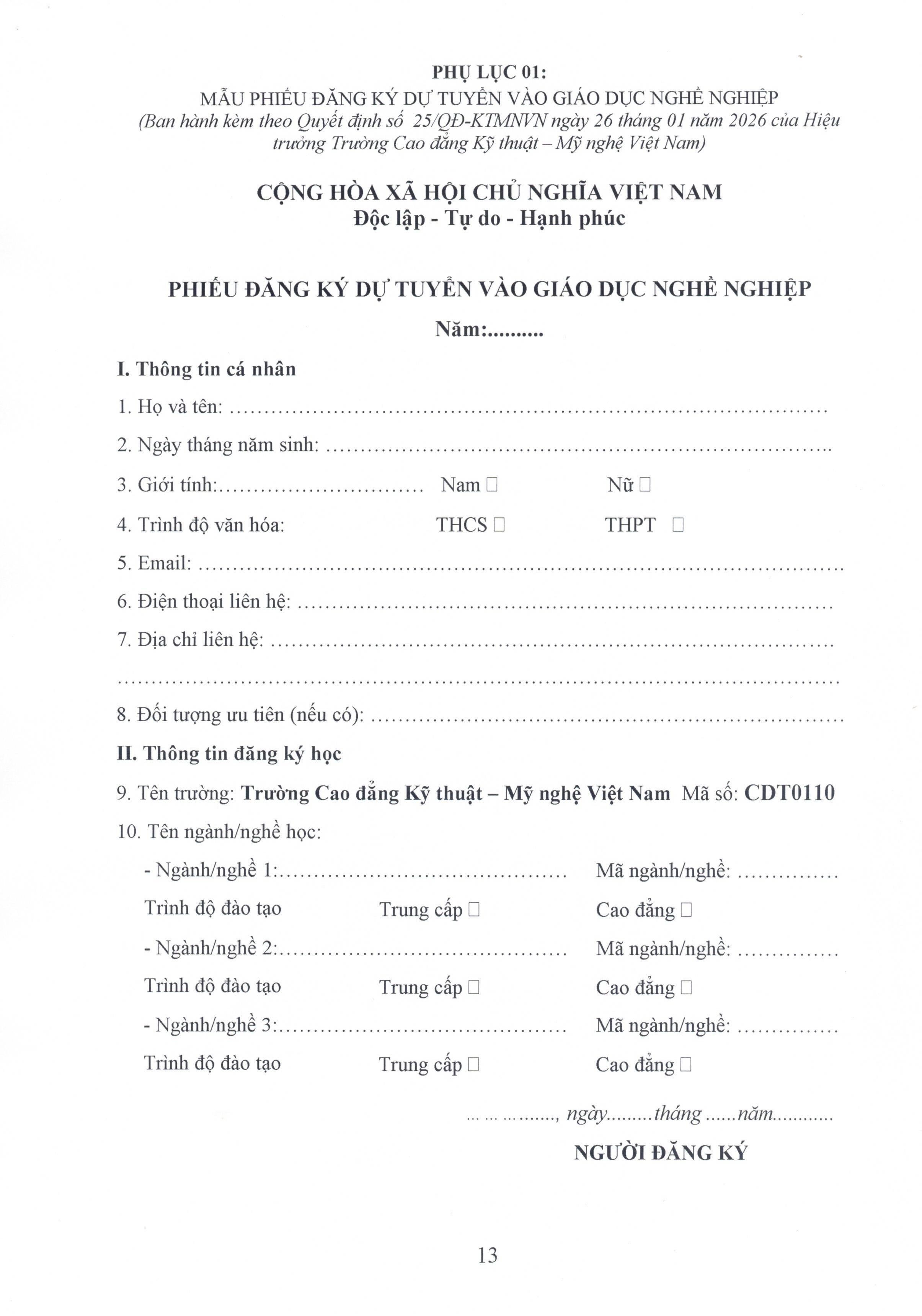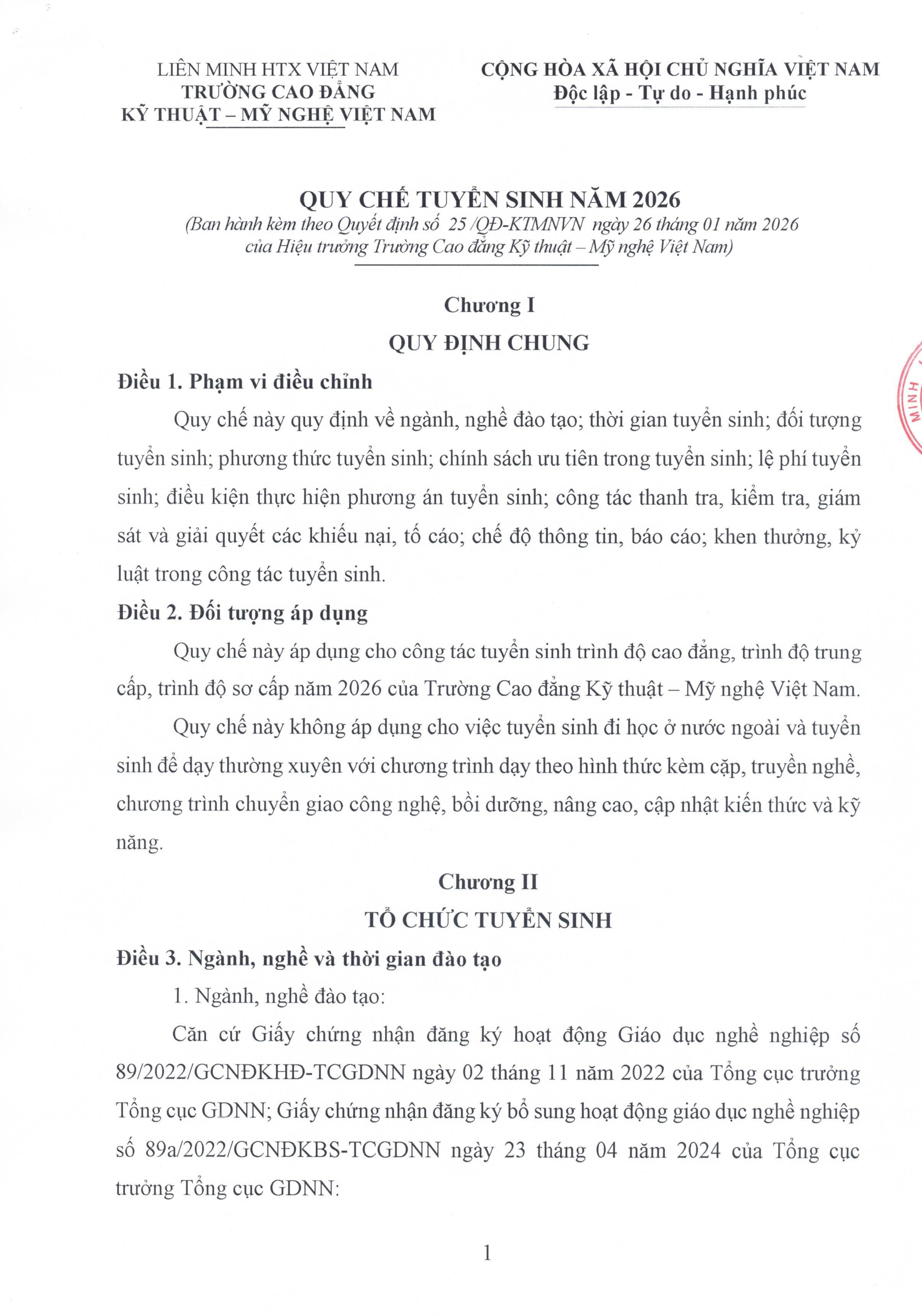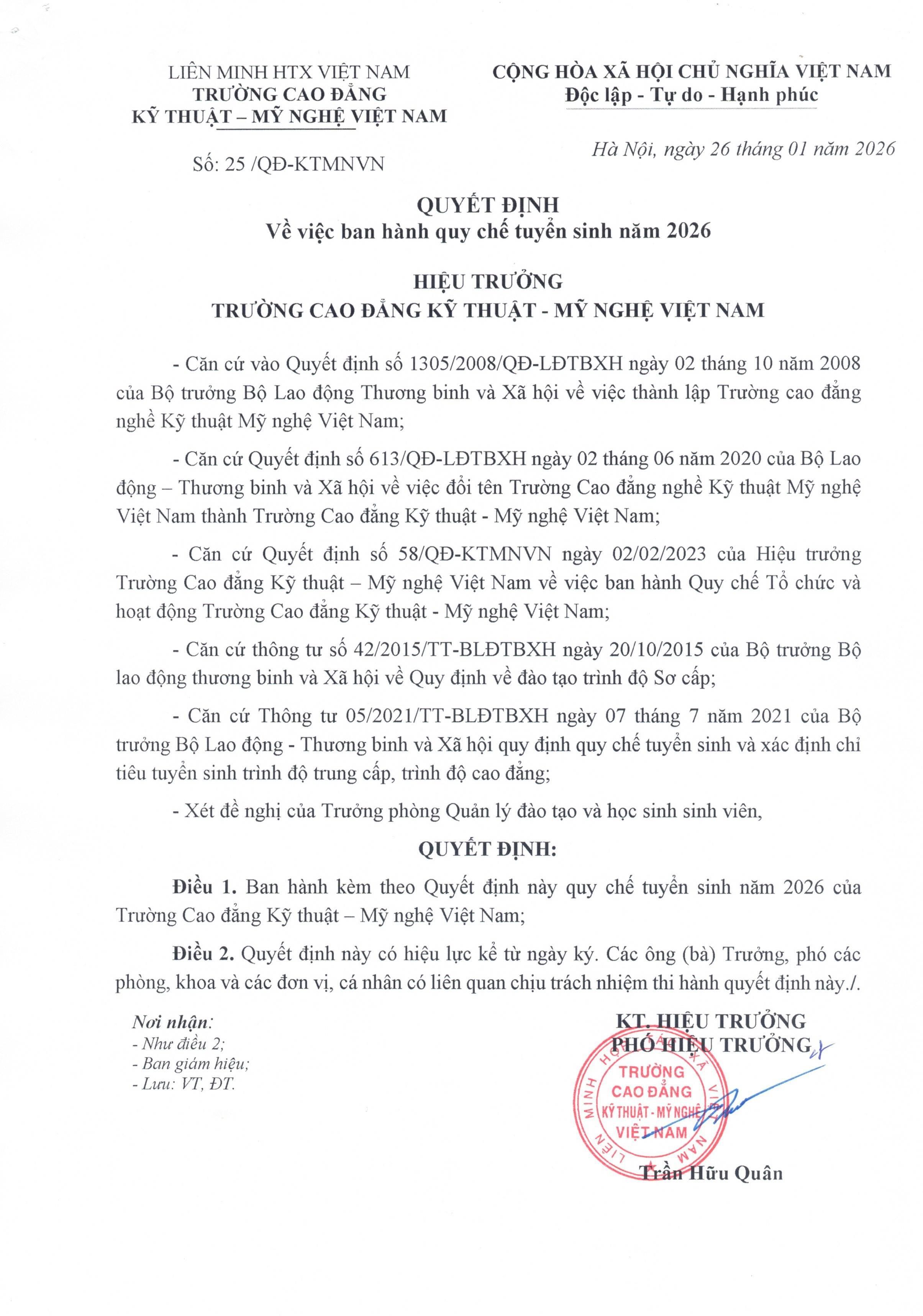 QUI CHẾ TUYỂN SINH NĂM 2026 Qui chế tuyển sinh năm 2026 của trường cao đẳng Kỹ thuật - Mỹ nghệ Việt Nam Ban truyền thông